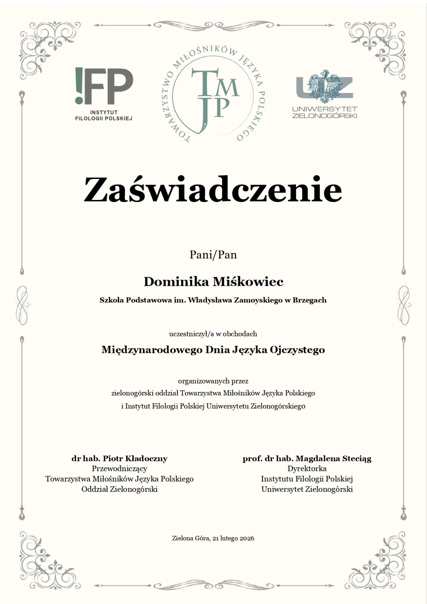 Składamy serdeczne podziękowania zespołowi zielonogórskiego oddziału Towarzystwa Miłośników Języka Polskiego za przygotowanie cennego materiału, służącego kształtowaniu świadomości językowej uczniów oraz uwrażliwianiu ich na poprawne posługiwanie się polszczyzną.