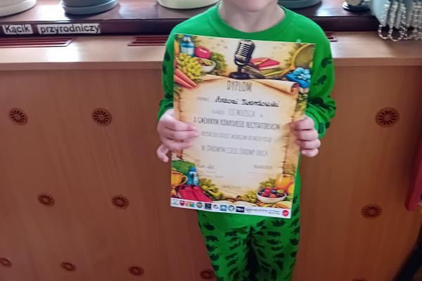 SUKCESY PRZEDSZKOLAKÓW W GMINNYM KONKURSIE RECYTATORSKIM Przedszkolaki reprezentowały nasz oddział przedszkolny na X Gminnym Konkursie Recytatorskim pt.,, Przyjaciele dzieci wierszem do nich piszą ”. Każdy uczestnik, wspaniale zaprezentował się na scenie, pokazując swoje uzdolnienia artystyczne. W tym roku, tematyka dotyczyła zdrowia i zdrowego stylu życia. Możemy z radością poinformować o wysokich wynikach konkursu: