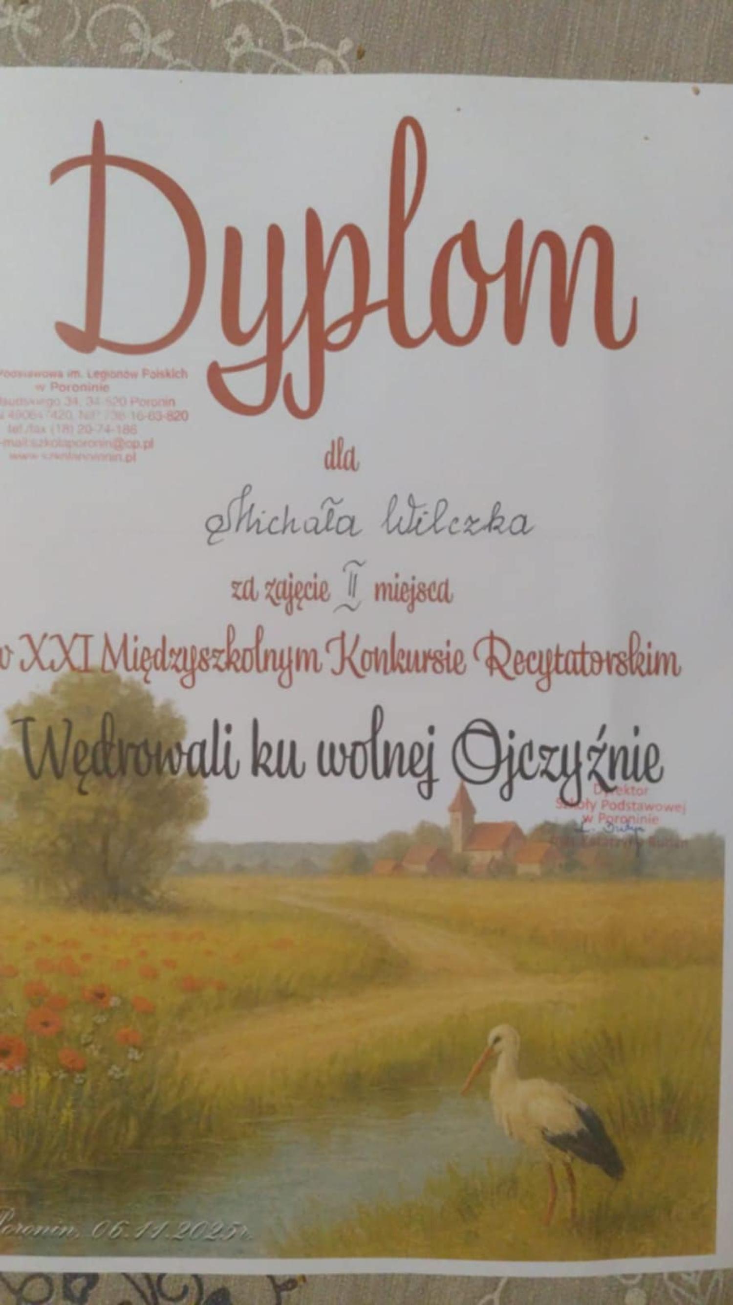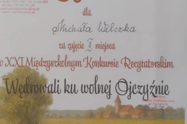 Z dumą informujemy, że Michał Wilczek zajął II miejsce w pierwszej kategorii wiekowej. Do konkursu przygotowała go Pani Zofia Pawlikowska - Topór. Gratulujemy wszystkim uczestnikom za piękne występy i godne reprezentowanie naszej szkoły!