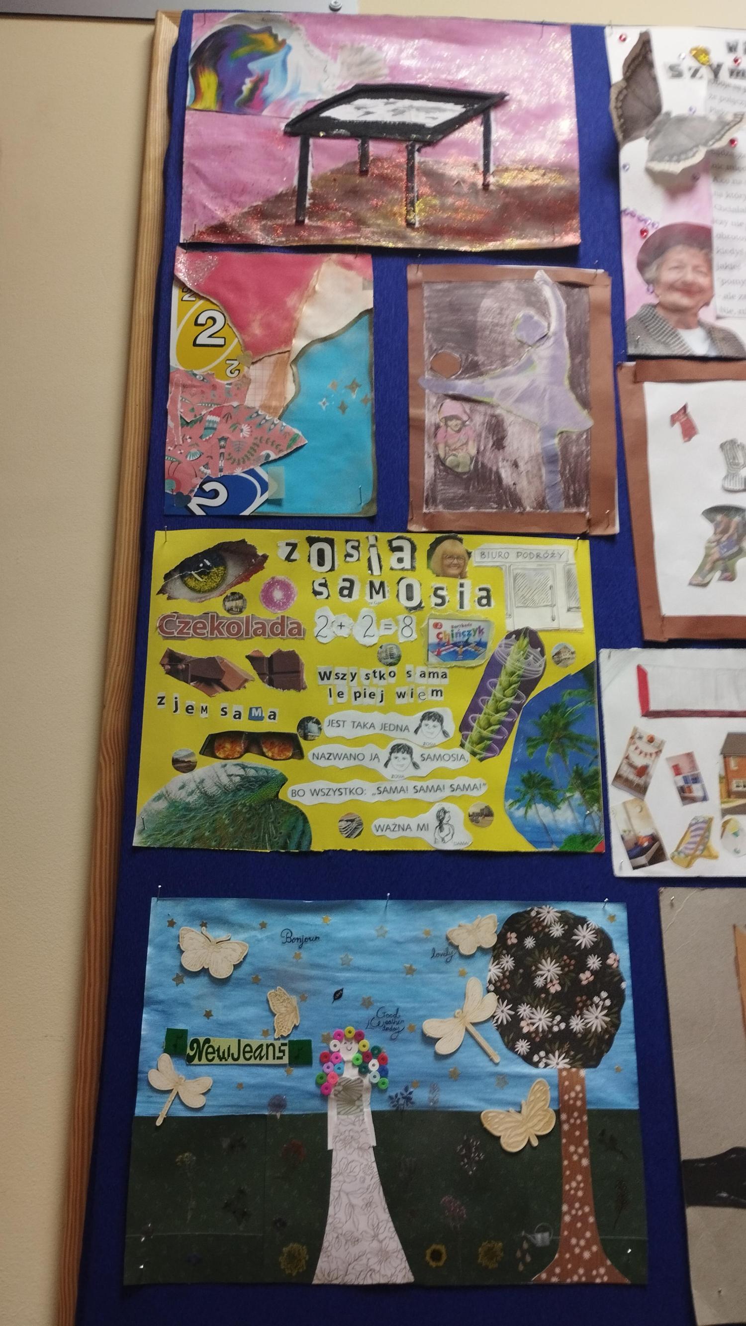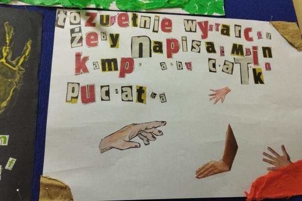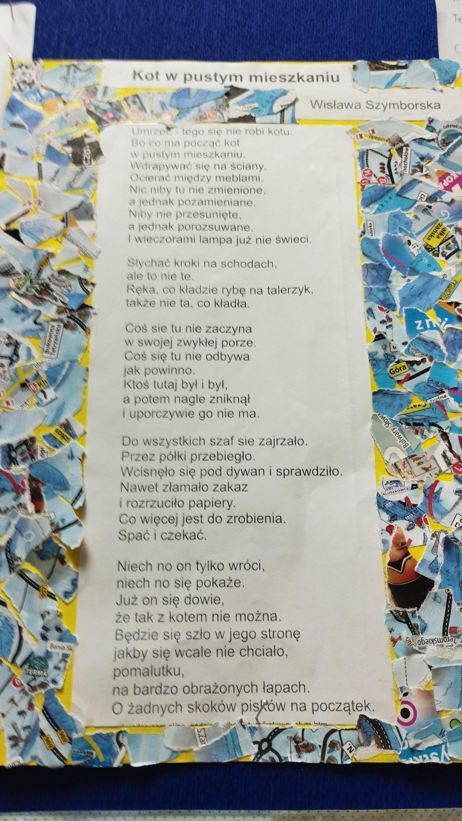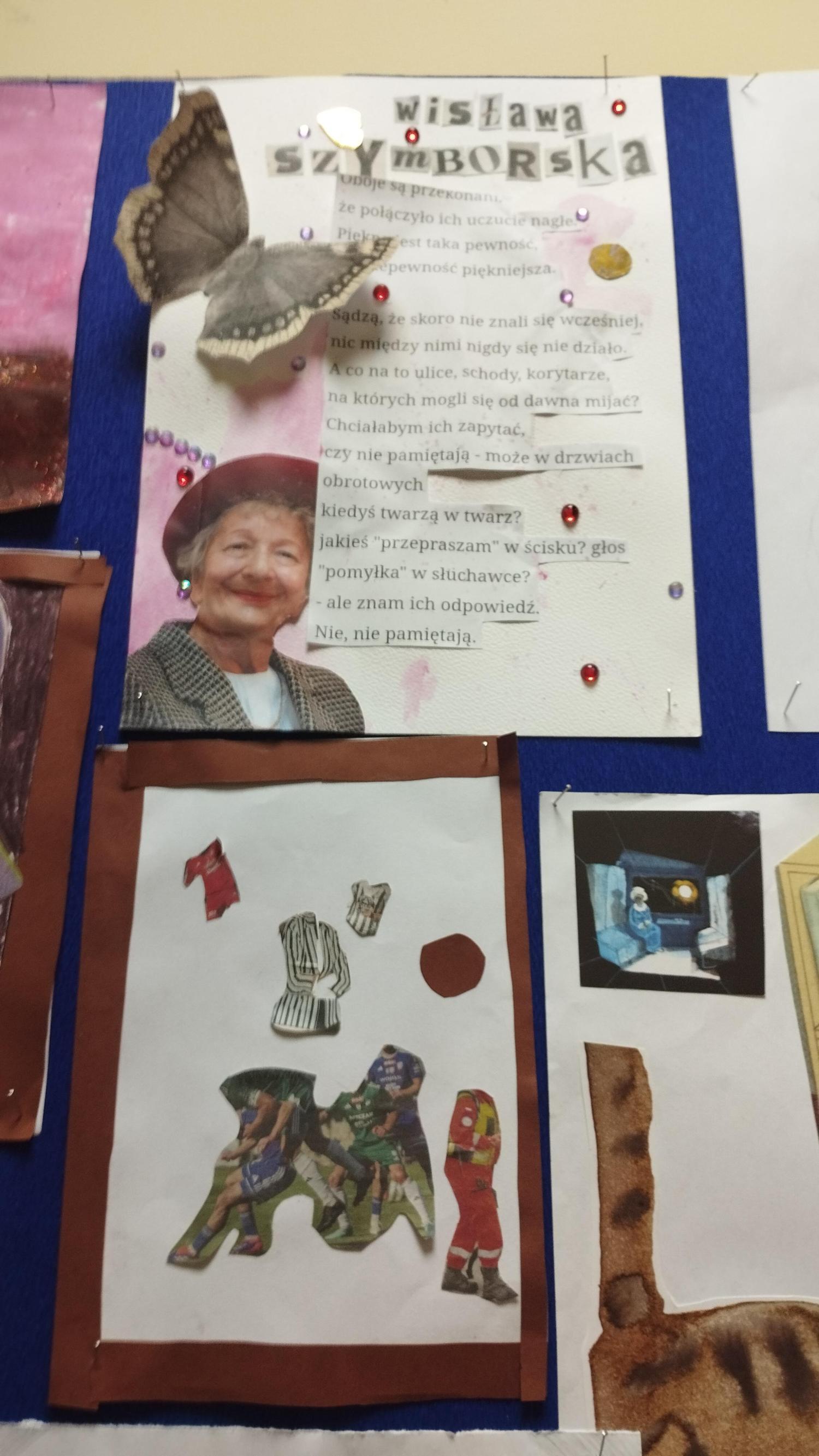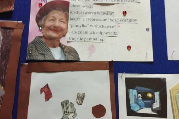 O wspomnianej wielkości Jej poezji dyskutowali uczniowie klasy 5 i 6. Ale czy nasza młodzież chodzi drogami znanymi i przewidywalnymi? Absolutnie nie! O Wisławie bowiem można mówić na milion sposobów, a jednym z nich niech będzie sztuka! Ach, jak bardzo poetka ukochała sobie tworzenie kartek z … niczego. Coś, co dla jednego było śmieciem, dla niej urastało do rangi tworzywa plastycznego. I tak powstawały pocztówki z wydartych stron gazet i resztek materiałów po szyciu spódnicy.